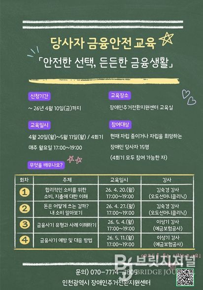 브릿지저널 김경미 기자 | 인천시사회서비스원 소속 인천시장애인주거전환지원센터는 당사자 금융 안전교육 ‘안전한 선택, 든든한 금융 생활’ 참가자를 모집한다고 6일 밝혔다.