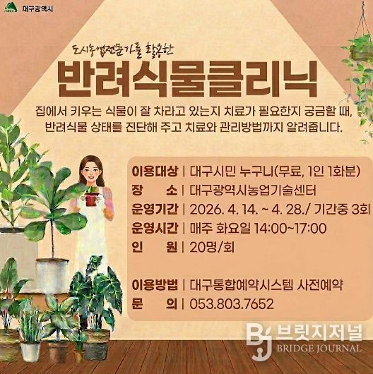 브릿지저널 김진석 기자 | 대구광역시농업기술센터는 도시농업 전문가를 활용해 오는 4월 14일부터 28일까지 매주 화요일, 총 3회에 걸쳐 ‘반려식물 클리닉’을 운영한다.