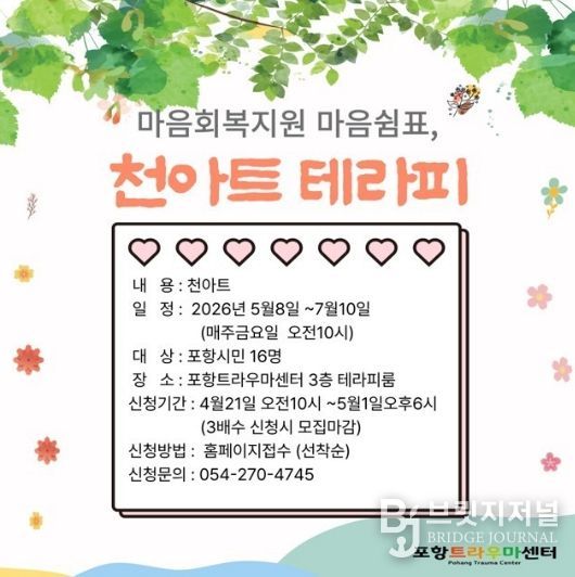 브릿지저널 정보영 기자 | 포항시 북구보건소 트라우마센터는 5월 8일부터 7월 10일까지 포항 시민을 대상으로 ‘마음쉼표, 천아트 테라피’ 프로그램을 주 1회 운영한다.