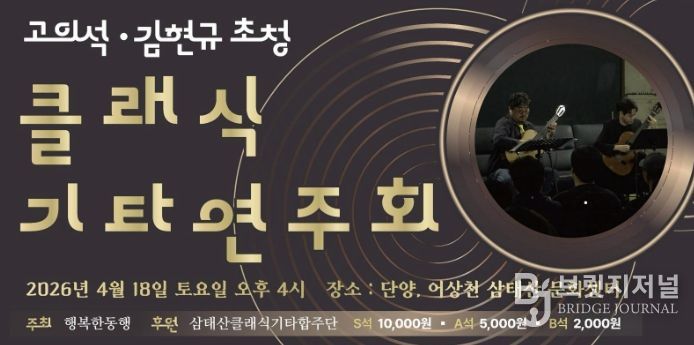 브릿지저널 김경미 기자 | 단양군 어상천 지역에서 활동하는 삼태산 클래식기타 합주단은 공연기획단체 행복한 동행(대표 홍원의)과 함께 오는 18일 오후 4시 어상천 삼태산문화센터에서 ‘고의석·김현규 초청 클래식기타 연주회’를 개최한다.
