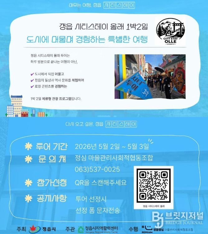브릿지저널 윤나영 기자 | 정읍시와 정읍시지역활력센터가 다가오는 5월 가정의 달을 맞아, 관외 거주 가족 단위 관광객을 대상으로 1박 2일 체류형 관광 프로그램인 ‘정읍 시티스테이 올래’ 참여자 30명을 오는 10일까지 모집한다.