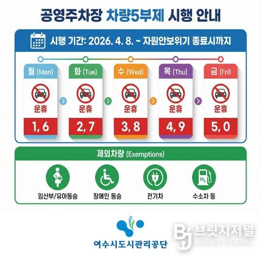 브릿지저널 김경미 기자 | 여수시도시관리공단(이사장 송병구)은 최근 중동 사태로 인한 자원안보 위기 ‘경계’ 단계 발령에 따라, 오는 4월 8일부터 자원안보 위기 경보 해제 시까지 관내 공영주차장을 대상으로 ‘차량 5부제’를 민간 부문까지 확대 시행한다고 밝혔다.