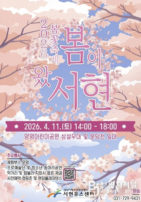 브릿지저널 김경미 기자 | 성남시청소년청년재단 서현유스센터는 4월 11일 14시부터 18시까지 양영어린이공원 일대에서 ‘제7회 청.마.닮’ 봄꽃축제 『봄이 왔서현!』을 개최한다.