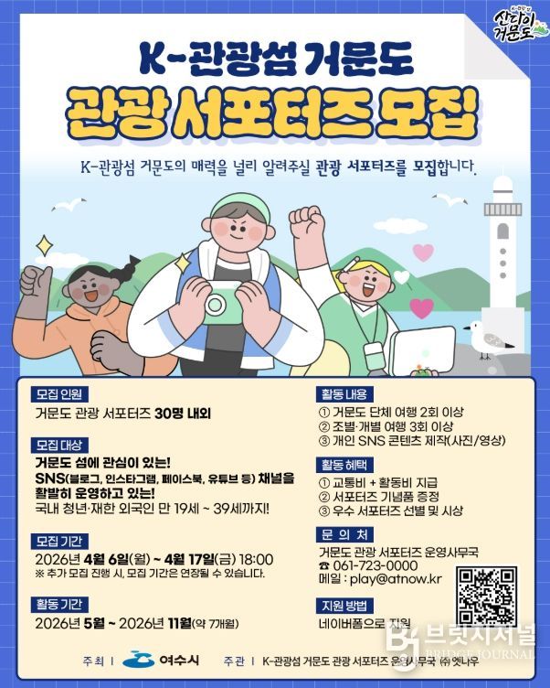 브릿지저널 김경미 기자 | 여수시는 거문도의 때 묻지 않은 자연과 신비로운 매력을 국내외에 알릴 ‘K-관광섬 거문도 관광 서포터즈’를 공개 모집한다고 밝혔다.
