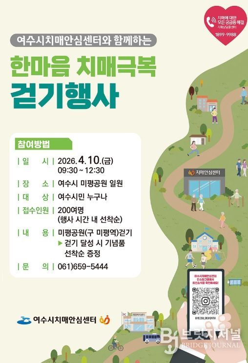 브릿지저널 김경미 기자 | 여수시는 오는 4월 10일 오전 9시 30분 미평공원 일원에서 ‘2026년 한마음 치매극복 걷기 행사’를 개최한다고 밝혔다.