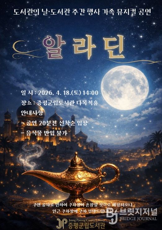 브릿지저널 김경미 기자 | 충북 증평군립도서관은 오는 18일 오후 2시 도서관 3층 다목적홀에서 어린이 뮤지컬 ‘알라딘’을 무료로 공연한다고 밝혔다.