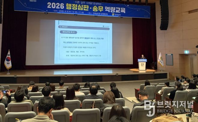 브릿지저널 김경미 기자 | 전라남도는 8일 도청에서 도 본청과 시군 행정처분 담당 공무원 300여 명을 대상으로 2026 행정심판·송무 역량교육을 했다.