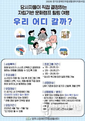 브릿지저널 김경미 기자 | 양주시장애인자립생활센터에서는 장애인 당사자가 직접 선택하고 결정하는 자립 기반 힐링 여행을 목적으로 하는 지역 장애인 문화캠프 [우리 어디 갈까?] 참가자를 모집한다.