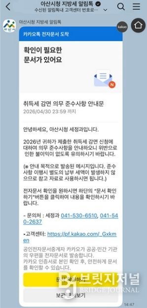 브릿지저널 정보영 기자 | 아산시는 취득세 감면 혜택을 받은 납세자가 준수사항 미숙지로 인해 가산세를 부담하는 사례를 방지하고자 ‘취득세 감면 의무 준수사항 카카오톡 알림톡 서비스’를 운영하고 있다.