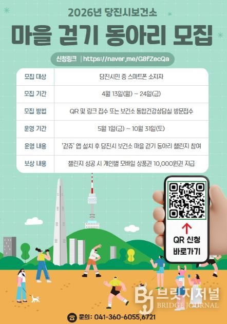 브릿지저널 정보영 기자 | 당진시는 지역 주민의 자발적 걷기운동 실천을 유도하고 주민 주도적 걷기 활성화를 위해 오는 13일부터 24일까지 마을 걷기동아리를 모집한다고 9일 밝혔다.