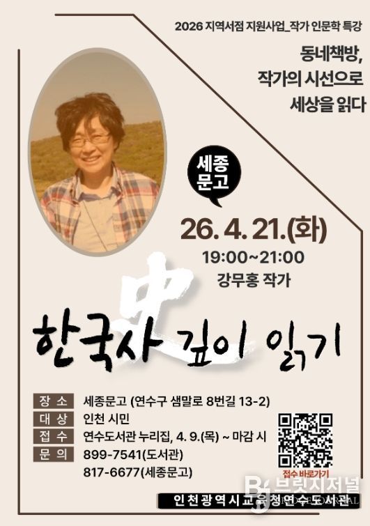 브릿지저널 김경미 기자 | 인천광역시교육청연수도서관은 오는 21일 지역서점 '세종문고'에서 강무홍 작가의 ‘한국사 깊이 읽기’ 인문학 특강을 개최한다.