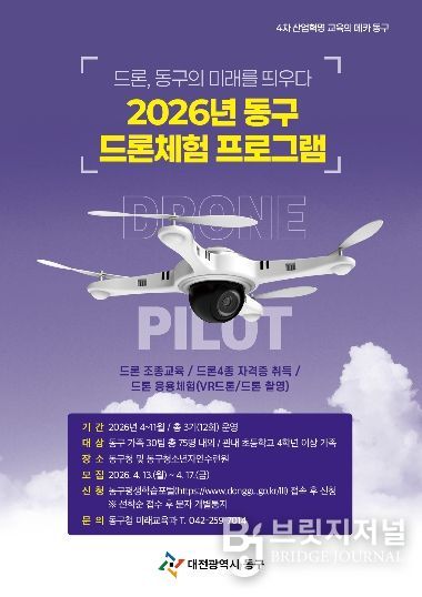 브릿지저널 정보영 기자 | 대전 동구는 4월부터 오는 11월까지 구청과 동구 청소년자연수련원에서 ‘2026년 드론체험 프로그램’을 운영한다고 9일 밝혔다.