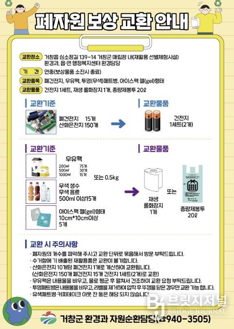 브릿지저널 김경미 기자 | 거창군은 자원순환 실천과 올바른 분리배출 문화 정착을 위해 폐자원보상 교환 사업을 확대 시행한다고 9일 밝혔다.