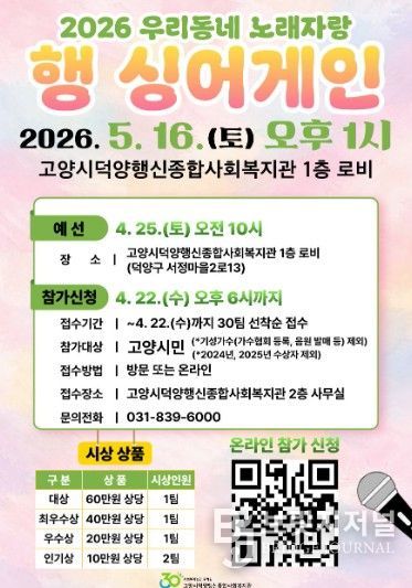 브릿지저널 김경미 기자 | 고양시덕양행신종합사회복지관은 주민노래자랑 ‘행싱어게인’에 참가할 다양한 재능과 끼를 가진 고양시민 30팀을 오는 4월 22일까지 선착순 모집한다.