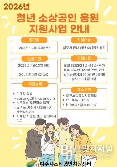 브릿지저널 김경미 기자 | 여주시소상공인지원센터는 여주 관내 청년 소상공인의 경영 안정과 자립 기반 강화를 위해 ‘2026년 청년 소상공인 응원 지원사업’을 추진한다고 밝혔다.