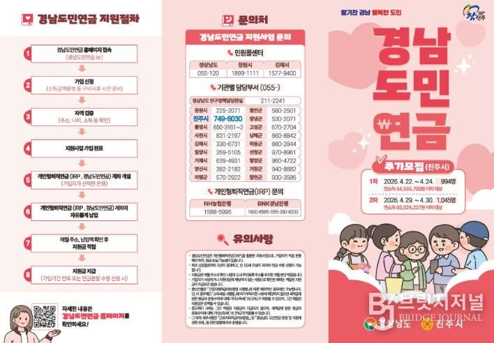 브릿지저널 김경미 기자 | 진주시는 지난 1월 ‘경남도민연금’ 모집 당시 접수 2일 만에 모집 인원 1001명이 조기 마감되는 등 시민들의 높은 정책 수요와 지속적인 추가 모집 요청을 적극 반영해 오는 22일부터 2039명 규모의 추가 모집을 시행한다고 밝혔다.