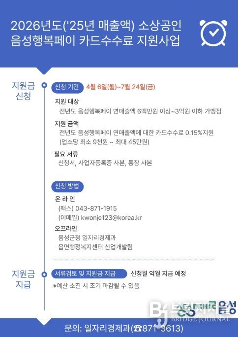 브릿지저널 김경미 기자 | 음성군이 고물가·고금리로 인한 관내 소상공인 경영 부담 완화를 위해 ‘음성행복페이 카드수수료 지원사업’을 추진하고 있다.