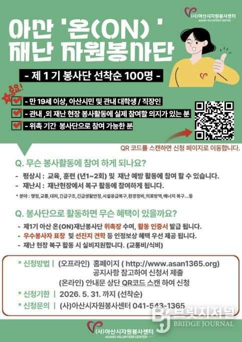 브릿지저널 정보영 기자 | 아산시는 5월 31일까지 ‘제1기 아산 온(ON) 재난봉사단’에 참여할 자원봉사자 100명을 모집한다고 밝혔다.