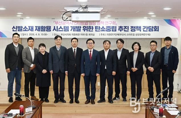 브릿지저널 윤나영 기자 | 부산광역시의회 의원연구단체인 '부산광역시 스타트업 성장 정책 연구회'는 4월 9일 오후 3시, 부산시의회 의원회관 회의실에서 ‘신발소재 재활용 시스템 개발을 통한 탄소중립 추진 정책 간담회’를 개최했다.