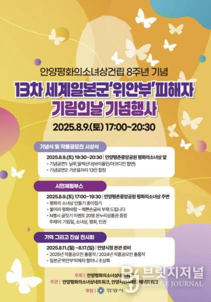 브릿지저널 김경미 기자 | 안양시는 오는 9일 오후 7시 30분 평촌중앙공원의 안양 평화의소녀상 앞에서 일본군 ‘위안부’피해자 기림의 날(8. 14.) 행사가 열린다고 8일 밝혔다.