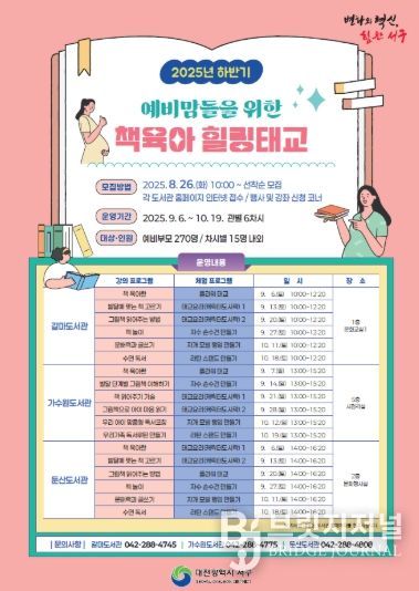 브릿지저널 정보영 기자 | 대전 서구는 임신부의 정서적 안정을 지원하고 지역사회 내 독서 중심 육아 문화를 조성하기 위해, ‘예비맘을 위한 책 육아 힐링 태교’를 오는 9월 6일부터 10월 19일까지 갈마·가수원·둔산도서관에서 운영한다.