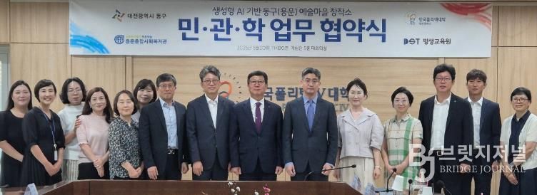 브릿지저널 정보영 기자 | 대전 동구는 20일 한국폴리텍Ⅳ대학 대전캠퍼스, 대전과학기술대학교, 용운종합사회복지관과 함께 ‘생성형 AI 기반 용운 예술마을창작소’ 운영을 위한 업무협약(MOU)을 체결했다고 밝혔다.
