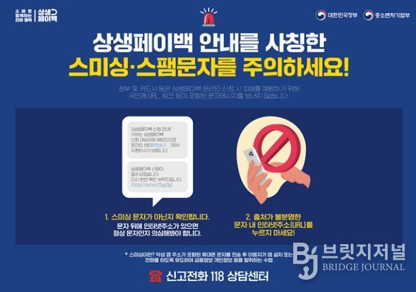아울러 사업 운영기간 동안 정부나 금융기관 등을 사칭한 보이스피싱(스미싱) 피해를 우려해, 중기부·카드사·소상공인시장진흥공단은 상생페이백과 관련하여 인터넷주소(URL), 링크가 포함된 문자, 카카오톡 등 메신저를 일절 발송하지 않을 예정이다.