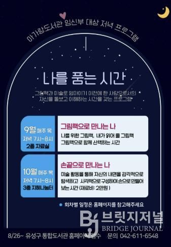브릿지저널 정보영 기자 | 대전 유성구는 9월부터 10월까지 아가랑도서관에서 임신부를 위한 감성 프로그램 ‘나를 품는 시간’을 운영한다.
