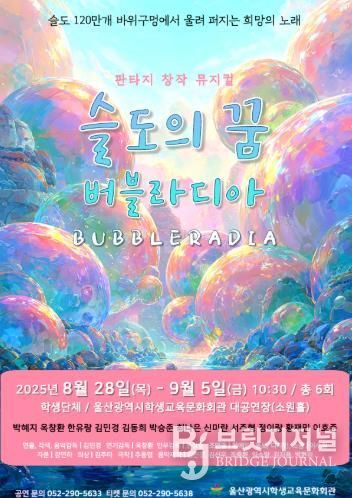 브릿지저널 윤나영 기자 | 울산광역시학생교육문화회관은 오는 28일부터 9월 5일까지 대공연장 소원홀에서 유치원 원아와 초등학교 1~4학년 단체를 대상으로 창작 뮤지컬 ‘슬도의 꿈 버블라디아’를 공연한다.