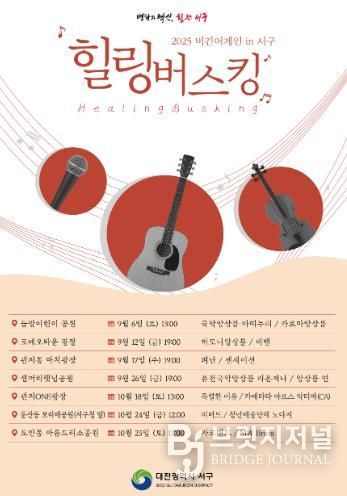 브릿지저널 정보영 기자 | 대전 서구는 지역 청년 음악인을 발굴·지원하는 ‘비긴어게인 in 서구 힐링 버스킹’ 하반기 첫 공연을 다음 달 6일 들말어린이공원에서 개최한다고 전했다.