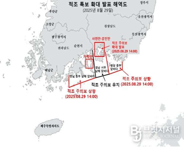 브릿지저널 김경미 기자 | 해양수산부는 8월 29일 16시부로 적조 위기경보 ‘경계’ 단계를 발령했다고 밝혔다.