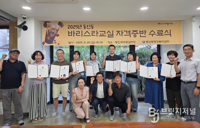 브릿지저널 김진석 기자 | 대구 중구 동인동행정복지센터는 지난 29일 동인세대공감마당(국채보상로149길 81)에서 ‘동인동 바리스타 교실 자격증반 수료식’을 개최했다.