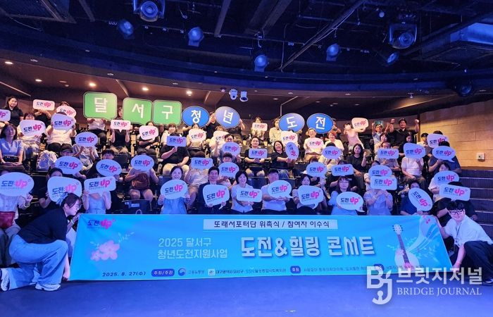브릿지저널 김진석 기자 | 대구 달서구는 지난 27일 꿈꾸는 씨어터에서 청년도전지원사업 ‘청년도전 힐링콘서트’를 열고, 참여 청년과 지역 주민 등 100여 명과 함께 공연·공감 대화를 통해 청년의 자존감 회복과 새로운 도전을 응원했다.