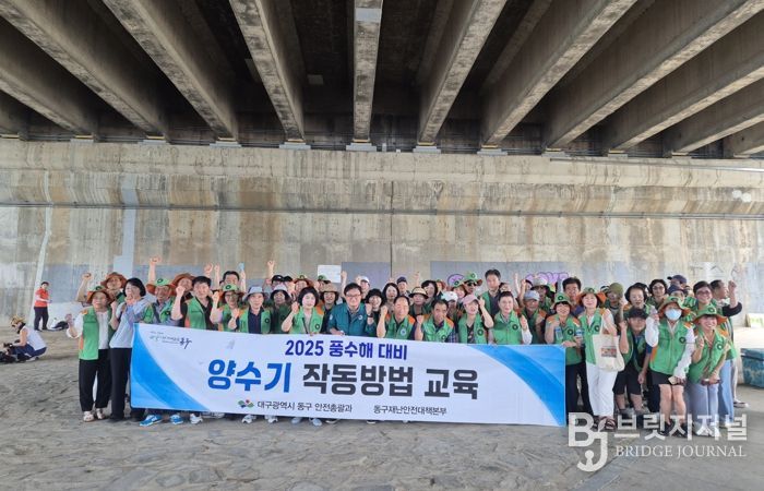 브릿지저널 김진석 기자 | 대구 동구청은 지난 8월 27일, 아양교 하부 둔치에서 동구 지역자율방재단 단원 및 관내 22개 동 행정복지센터 재난안전담당자 100여명이 참여한 가운데 양수기 작동법 교육을 실시했다.