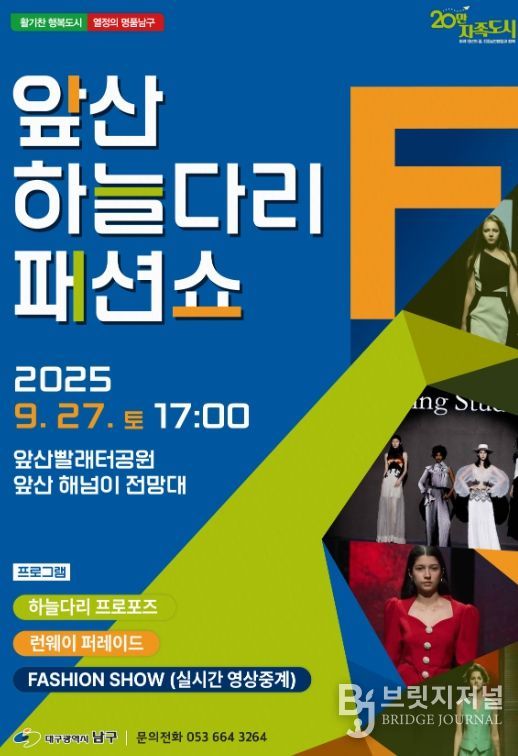 브릿지저널 김진석 기자 | 대구 남구는 오는 9월 27일 지역의 대표 관광명소인 앞산빨래터공원에서 하늘다리 패션쇼와 프러포즈 이벤트를 개최한다고 밝혔다.