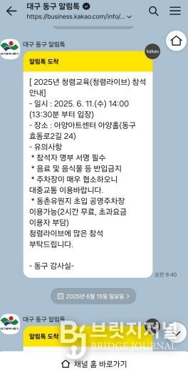 브릿지저널 김진석 기자 | 대구 동구청 ‘스마트 통합메시징 시스템’이 대구광역시가 주관하는 2025년 생활밀접 민원제도개선 우수사례에서 장려상을 받았다. 이번 수상으로 대구 동구는 대구광역시장상을 비롯해 50만원의 상금을 받게 됐다.