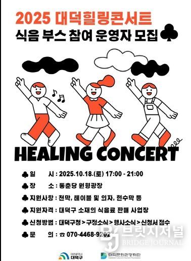 브릿지저널 정보영 기자 | 대덕문화관광재단(이사장 최충규)은 오는 10월 18일 동춘당 원형광장에서 열리는 ‘2025 대덕힐링콘서트’ 현장 운영을 맡을 식음(푸드·음료) 부스 운영자를 공개 모집한다고 밝혔다.