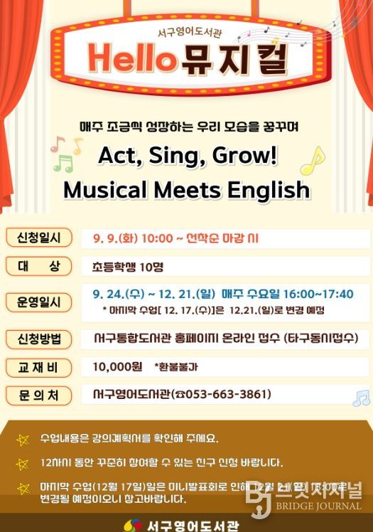 브릿지저널 김진석 기자 | 대구 서구 영어도서관은 초등학생을 위한 특별 강좌 'Hello 뮤지컬'을 9월 24일부터 12월 21일까지 운영한다고 밝혔다.