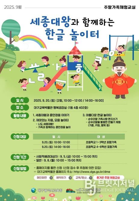 브릿지저널 김진석 기자 | 대구시교육청 산하 대구교육박물관은 제579돌 한글날을 기념하여 9월 20일, 어린이와 가족이 함께하는 특별한 가족 체험 프로그램을 운영한다.