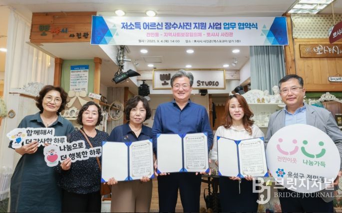 브릿지저널 정보영 기자 | 대전 유성구는 4일 전민동과 전민동지역사회보장협의체 뽀샤시 사진관이 저소득 어르신 장수 사진 지원을 위한 업무 협약을 체결했다고 밝혔다.