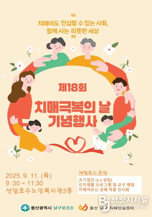 브릿지저널 윤나영 기자 | 울산 남구보건소 치매안심센터는 치매극복의 날(9월 21일)을 앞두고 오는 11일 치매환자와 가족, 지역주민을 초청해 선암호수공원노인복지관 3층에서‘제18회 치매극복의 날 기념행사’를 개최한다.
