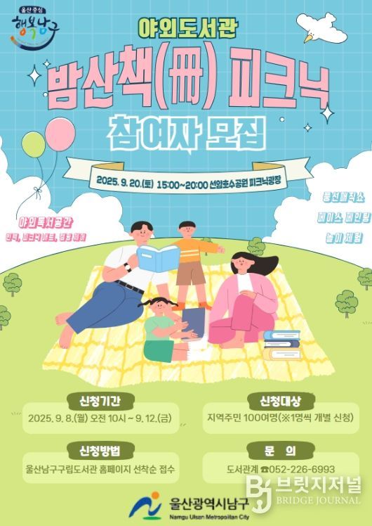 브릿지저널 윤나영 기자 | 울산 남구는 독서의 달을 맞아 오는 20일 선암호수공원 피크닉광장에서 야외도서관 ‘밤산책(冊) 피크닉’을 운영한다.