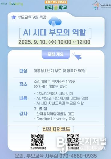 브릿지저널 김진석 기자 | 대구 수성구가 운영하는 ‘부모성장교육, 바라봄학교’는 오는 10일 오전 10시 수성대학교 리오바관에서 아동·청소년기 자녀를 둔 부모 및 양육자를 대상으로 9월 부모교육 특강을 개최한다.
