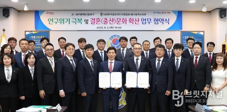 브릿지저널 김진석 기자 | 대구 달서구는 지난 2일 (사)한국청년지도자연합회 대구광역시지부와 초저출생 인구위기 극복을 위해 공동 대응하고,‘잘 만나보세’뉴(NEW) 새마을운동(결혼문화) 확산 등을 위한 업무 협약을 체결했다.