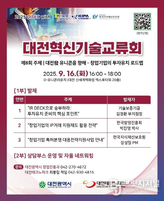 브릿지저널 정보영 기자 | 대전시는 9월 16일 대전신세계 엑스포타워 20층 유니콘라운지에서 ‘제8회 대전혁신기술교류회(DITEC)’를 열고, 기술보증기금·한국발명진흥회·한국지식재산보호원 등 혁신기술 지원기관과 함께 창업기업의 투자유치 전략부터 지식재산 거래·보호, 특허·상표 분쟁 대응까지 실무 중심 지원 정보를 제공한다.