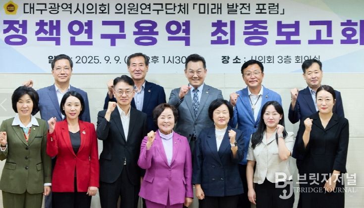 브릿지저널 김진석 기자 | 대구시의회 의원연구단체 ‘미래 발전 포럼’(대표 이영애 의원)은 9월 9일, 시의회 3층 회의장에서 '강정고령보 디아크 및 주변 자원 명소화 방안 연구'와 '대구광역시 기금 활성화 및 운용 개선방안 연구' 등 2개 정책연구용역의 최종 보고회를 개최했다.