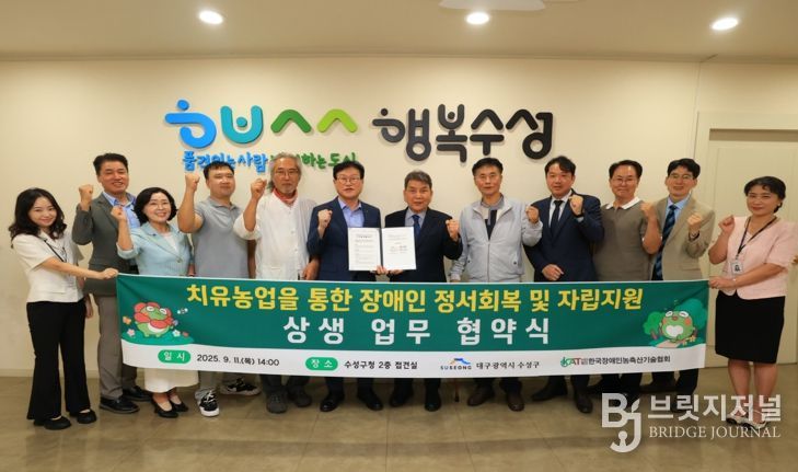 브릿지저널 김진석 기자 | 대구 수성구와 (사)한국장애인농축산기술협회 중앙회는 지난 11일 치유농업을 통한 장애인의 정서회복과 자립지원 상생 업무 협약(MOU)을 체결했다.