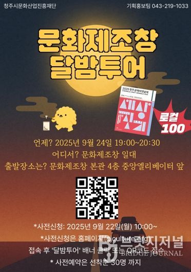 브릿지저널 김경미 기자 | 청주시문화산업진흥재단이 22일 오전 10시부터 ‘문화제조창 달밤투어’ 9월의 두 번째 투어객 모집에 들어간다.