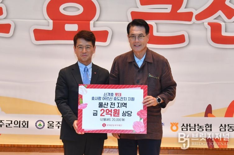 브릿지저널 윤나영 기자 | 롯데삼동복지재단(이사장 장혜선)이 울주군 12개 읍면 경로잔치에 참석하는 어르신을 위해 총 1억원 상당의 선물세트 1만개를 지원했다.