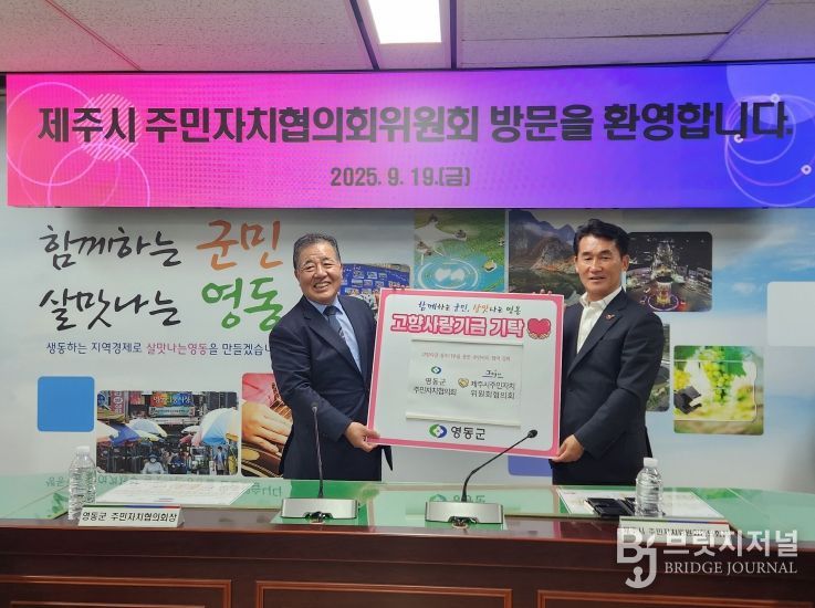 브릿지저널 김경미 기자 | 충북 영동군 주민자치협의회(회장 김재구)는 지난 19일, 2025 영동세계국악엑스포 개최를 축하하기 위해 영동군을 방문한 제주시 주민자치위원회협의회(회장 고정학)와 고향사랑기부금 상호 기부식을 진행했다고 밝혔다.